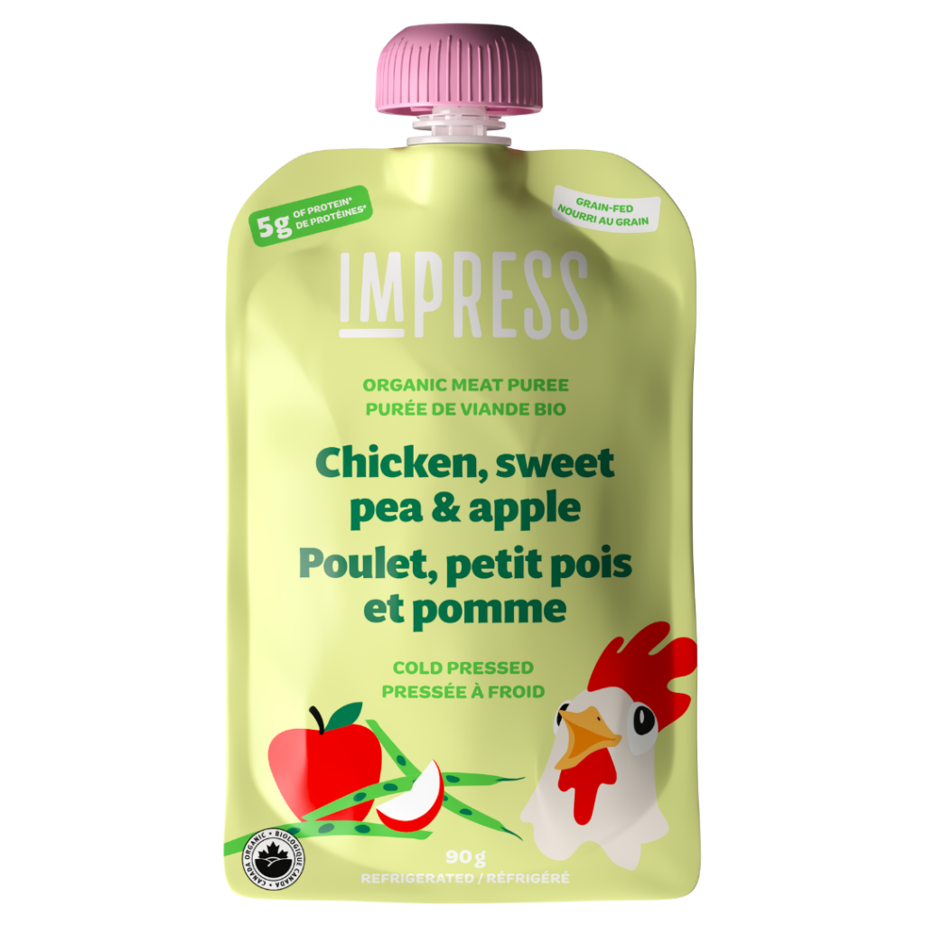 Pomme*, Poulet*, Petit pois*, Jus de citron*. *Biologique